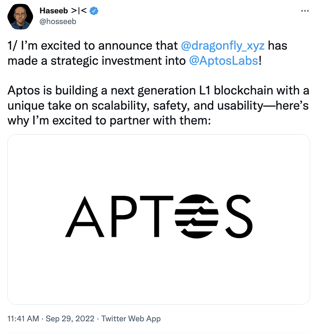 CoinVoice最新获悉:9 月 29 日,Dragonfly 管理合伙人 Haseeb 在社交媒体上发文表示,Dragonfly 已完成对新公链项目 Aptos 的战略投资,具体金额暂未透露。