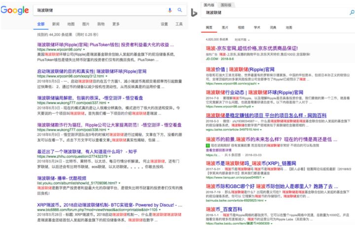 区块律动 BlockBeats 再尝试用 Google 和必应搜索瑞波联储搜索相关的广告信息,发现二者都没有出现百度上的数字加密货币广告,只有必应的首条为京东名为「瑞波特」的药物广告。