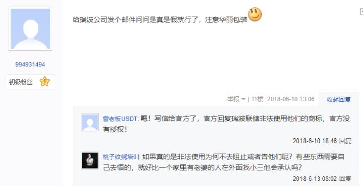 有用户建议给瑞波公司发个邮件问问瑞波联储与瑞波的关系,其他用户回复称瑞波已经回复,是瑞波联储非法使用瑞波商标,官方并没有授权。一名「桃子纹绣培训」用户附言回答称,「如果真的是非法使用为何不去阻止或者告他们呢?有些东西需要自己去悟的,就好比一个家里有老婆的人在外面找小三他会承认吗?」