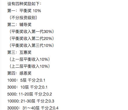 根据瑞波联储成员在网上公开发布的销售信息,每个人都可以发展下线,因此得到提成。具体层级收益可分为四种:平衡奖(10%),辅导奖(三代共 60%),互惠奖(二代共 20%),感恩奖(5—40 层千分之 0.1 到 0.4 不等)。