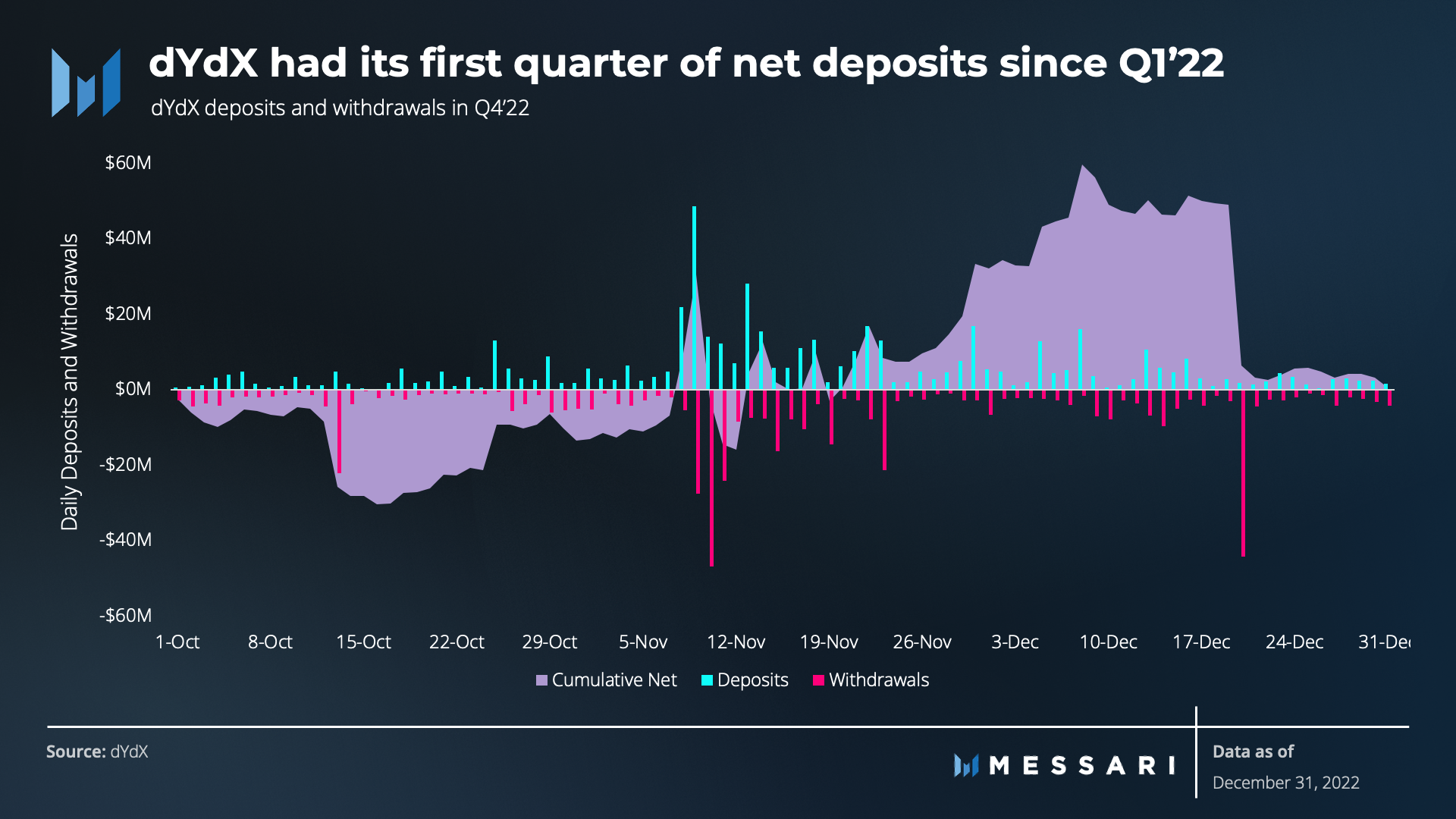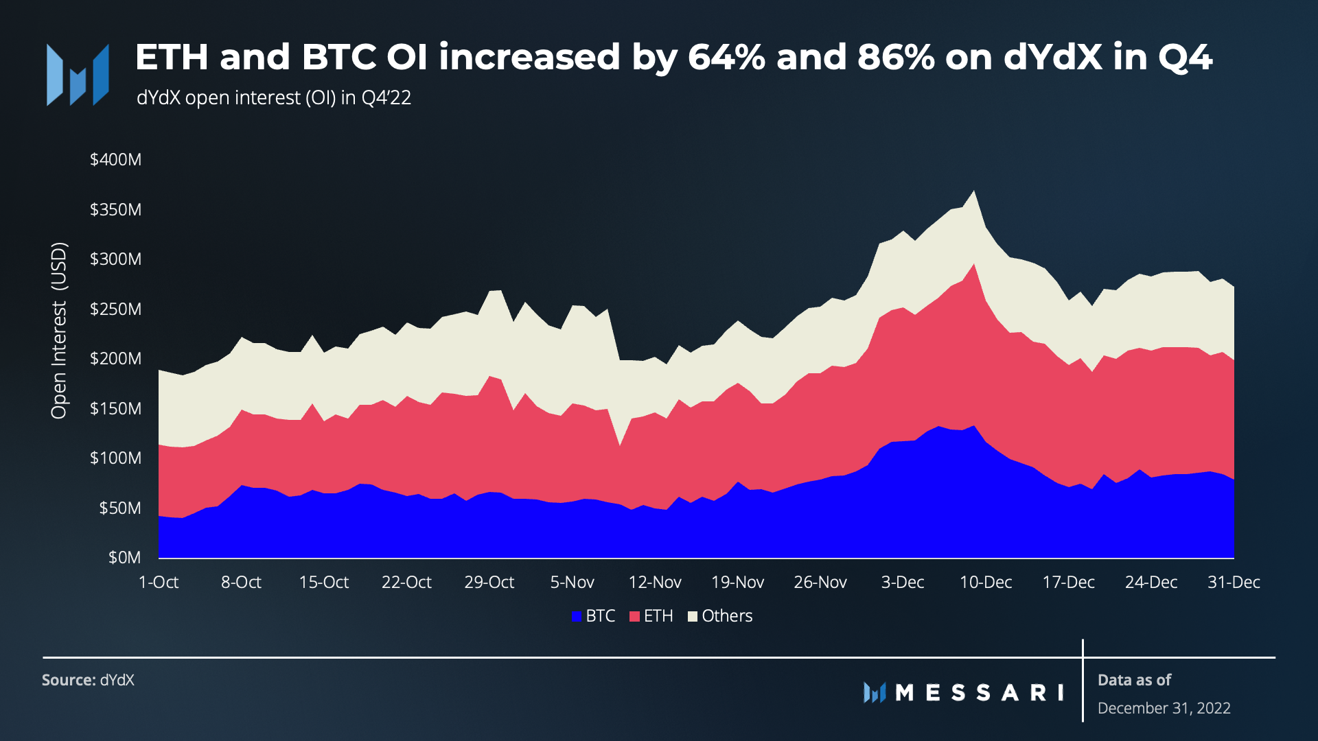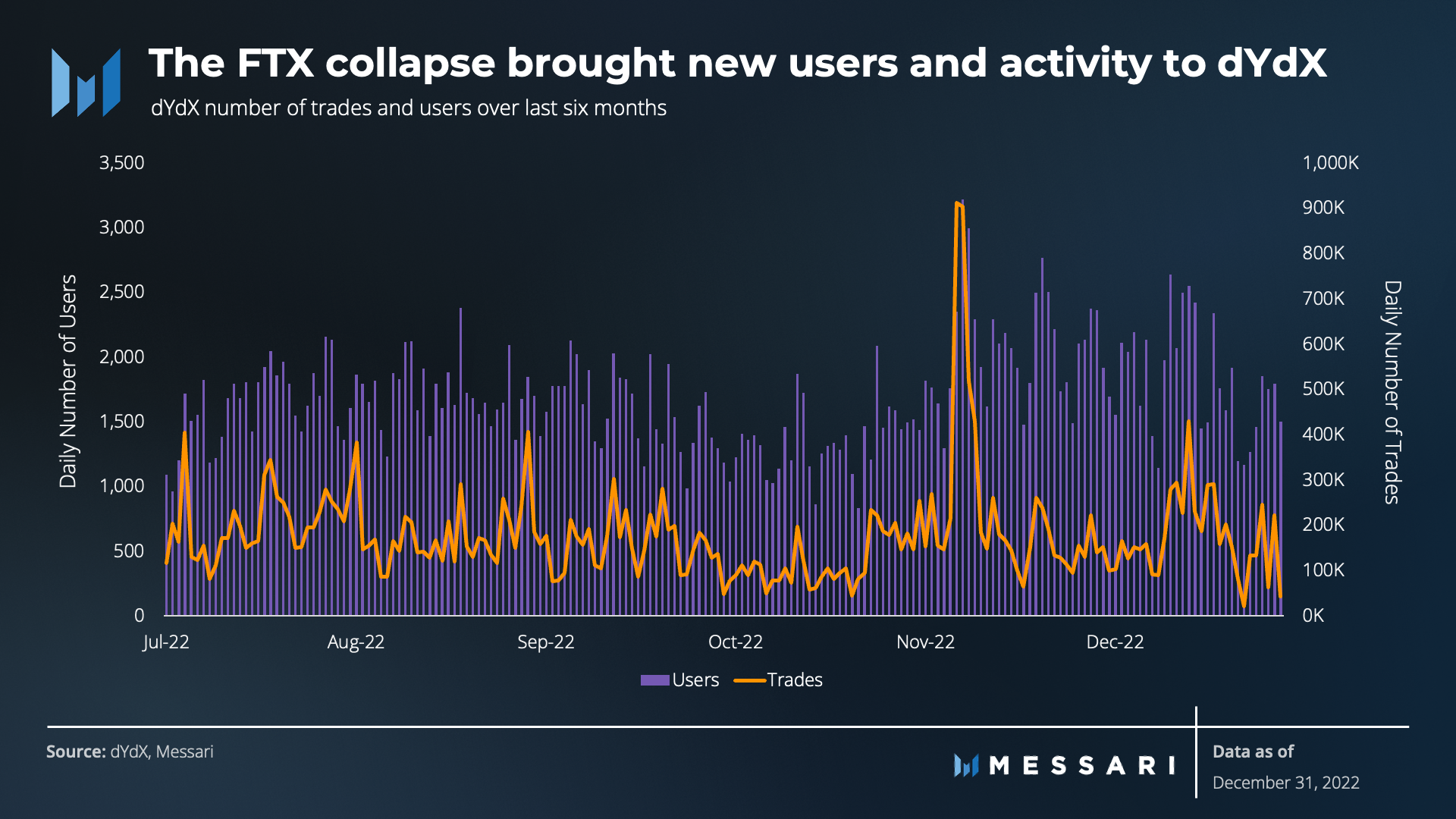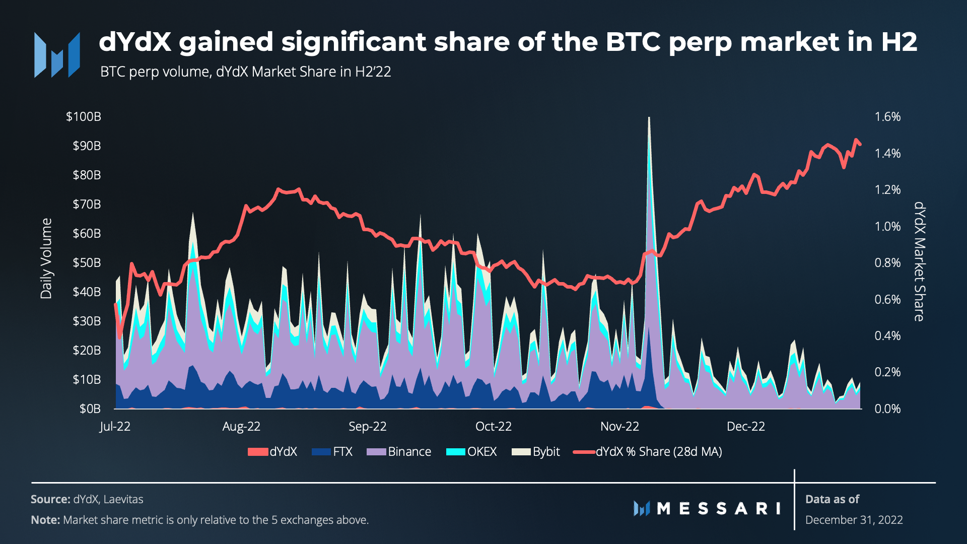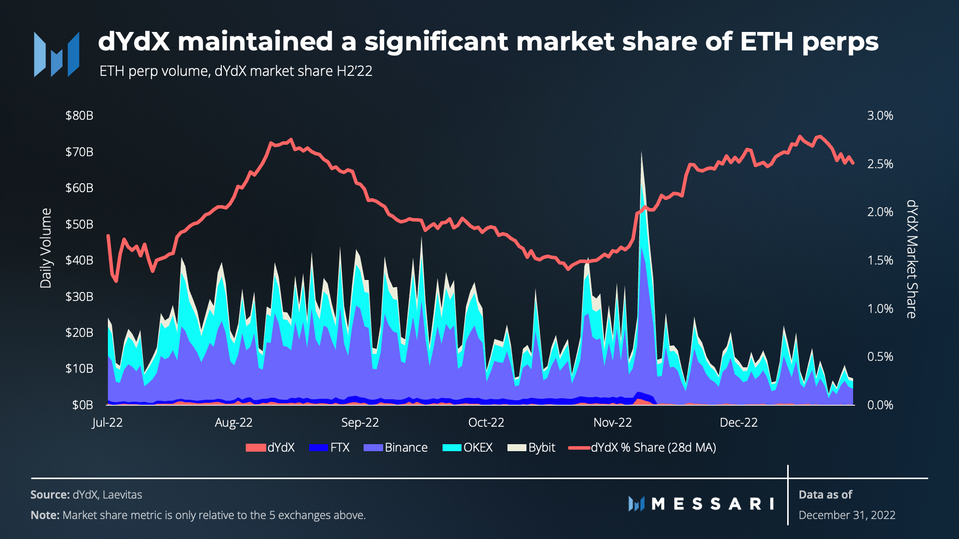 按季度计算,dYdX 的市场份额稳定在 2.1%。然而,当将第四季度时间线划分到 FTX 崩溃后,市场份额跃升至 2.6%,表明即使在不确定时期,该协议也能为其用户提供可靠稳定的交易环境。