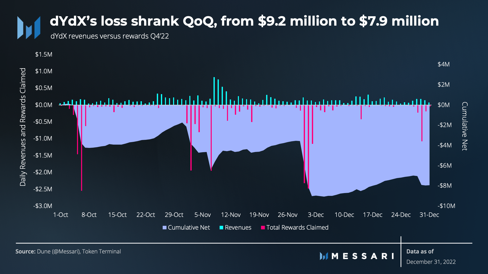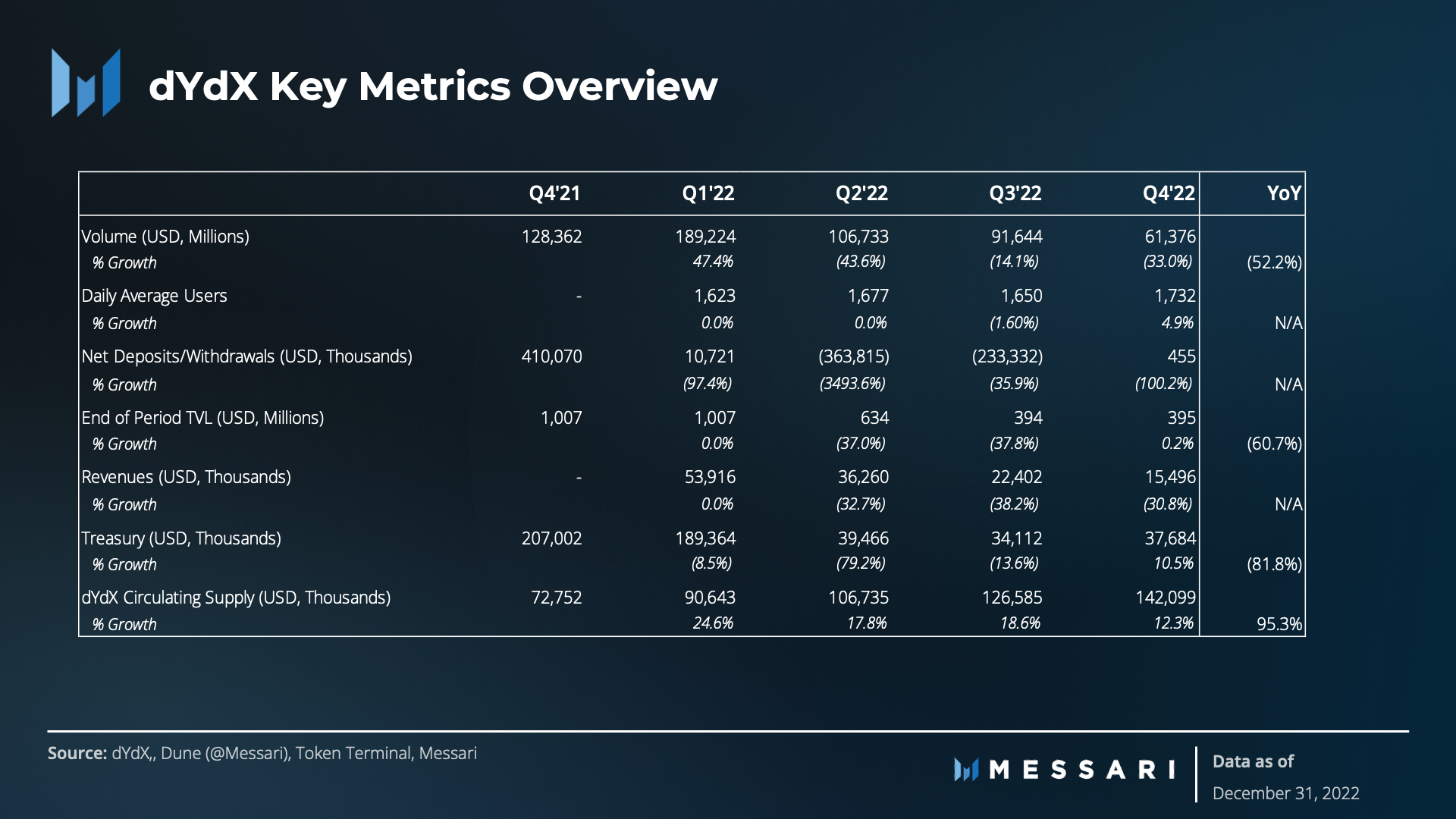 在第四季度,dYdX 的交易数量中位数环比下降 10%,每日活跃用户(DAUs)中位数下降 2%。这两项指标在 10 月份都达到了年度低点,这对第四季度的整体数据产生了负面影响。