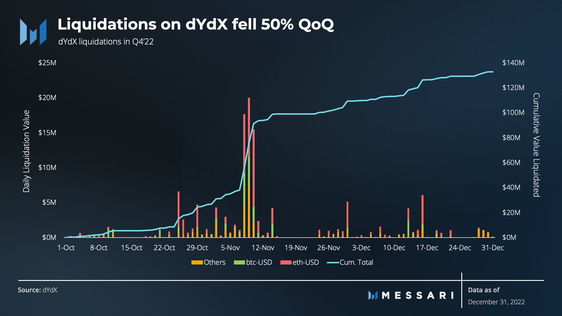 dYdX 在第四季度的净亏损减少了 14%,这主要是由于社区决定关闭流动性质押模块(LSM)。尽管环比交易量下降了 33%,但 FTX 崩溃推动了协议使用,DAUs 中位数增加了 41%,此后观察到的交易数量中位数增加了 36%。该平台在第四季度的未平仓量也增加了 43%,清算量减少了 50%。总体而言,随着社区继续改善用户体验并削减成本,该社区正显示出增长和稳定的积极迹象。