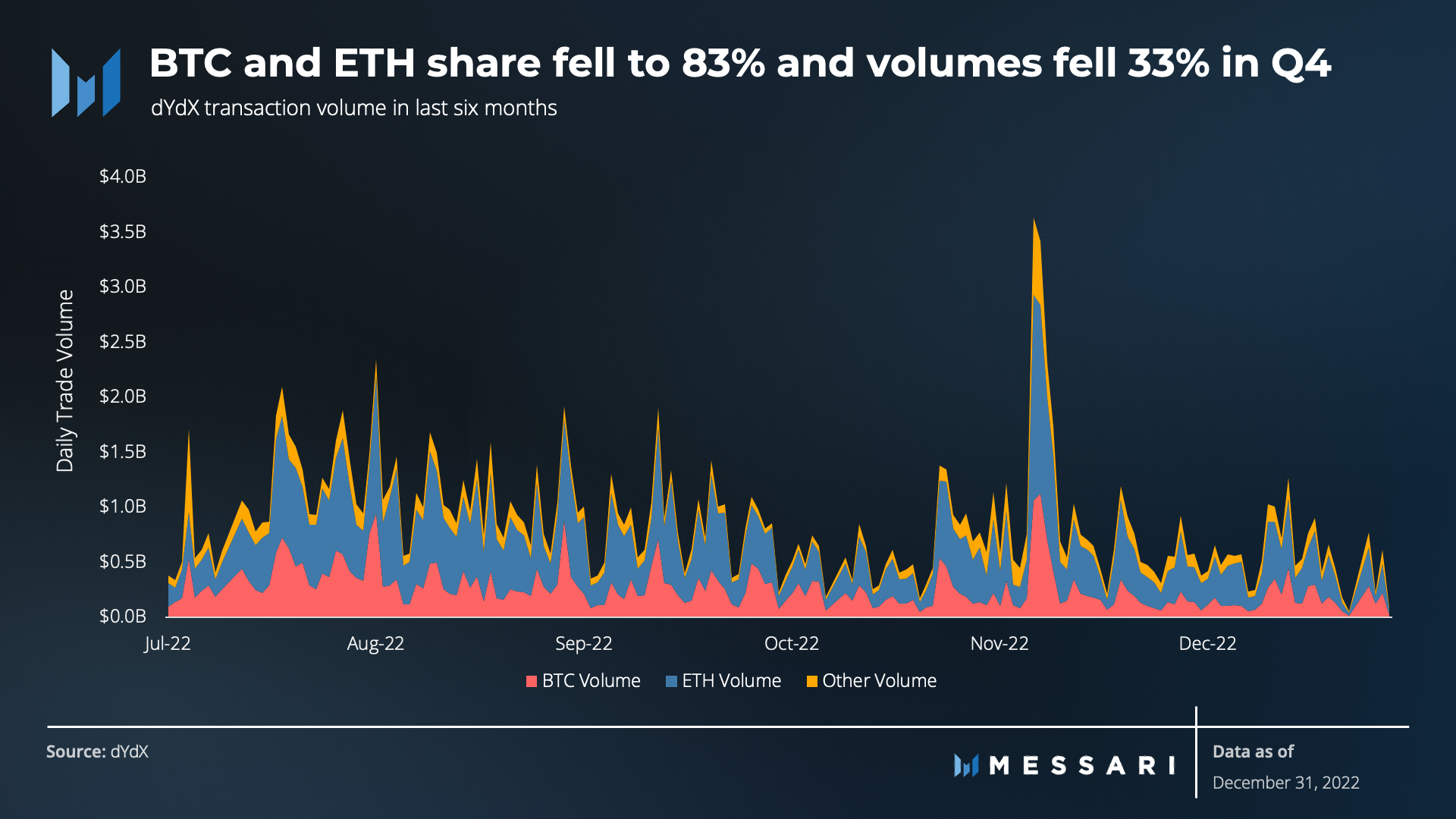 在第四季度,dYdX 的季度环比(QoQ)交易量下降了 33%,从 9160 万美元下降到 6140 万美元。此外,BTC 和 ETH 在总交易量中的份额从 87% 下降到 83%,其中 Doge 交易量的增加占了差异的 48%。第四季度的一个大交易量事件围绕着 FTX 的崩溃,从 11 月 8 日开始的四天内产生了季度交易量的 18%。