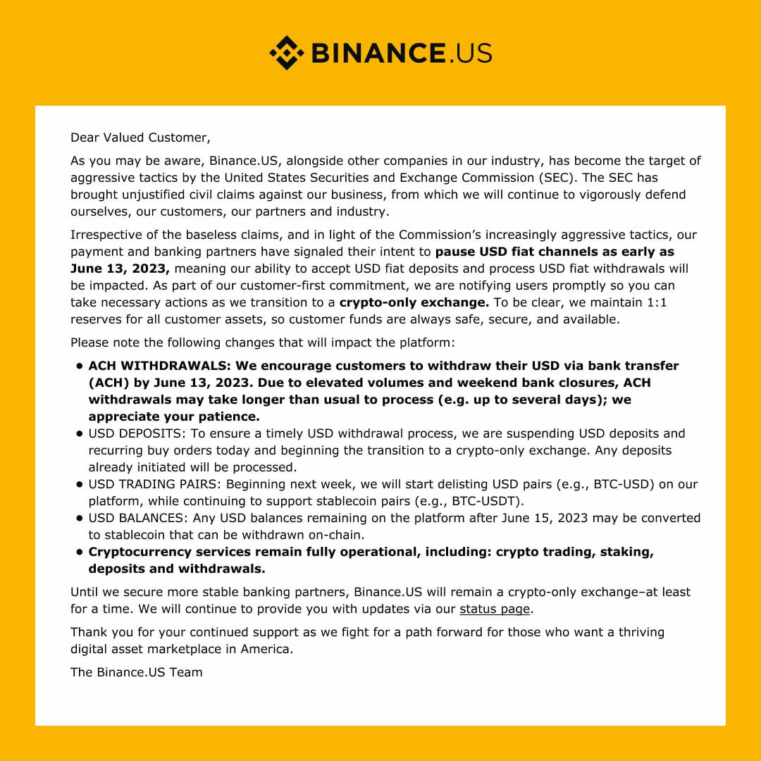 CoinVoice最新获悉:Binance.US 宣布将暂停美元存款,其银行合作伙伴正准备在 2023 年 6 月 13 日暂停法定货币美元提款渠道,鼓励客户在 6 月 13 日之前提取美元(可能会存在延时)。Binance.US 表示,正在采取积极措施,在一段时间内过渡到仅限加密货币的交易所。Binance.US 将为所有客户资产维持 1:1 储备。处理提款过程中的任何宕机(downtime)都可能是提款量增加和周末银行关闭的结果。
