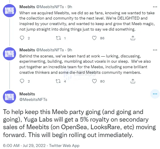 CoinVoice最新获悉:7 月 29 日,Yuga Labs 将对旗下 Meebits 系列 NFT 在所有 NFT 二级市场(如在 OpenSea、LooksRare)上的交易收取 5% 的版税,用于团队运营等。 BlockBeats 此前报道,3 月 12 日,Yuga Labs 宣布收购 Larva Labs 开发的 CryptoPunks 和 Meebits NFT 系列。Yuga Labs 计划将这两个 NFT 系列的全部商业权利提供给持有者。